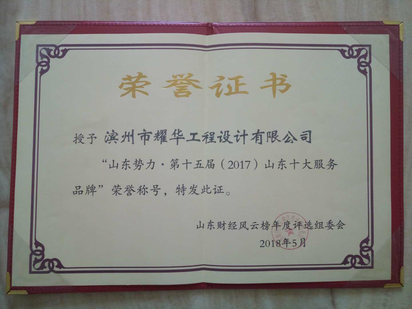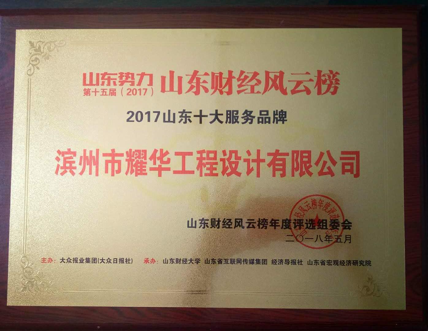 2018年5月30日,“山東勢力·第十五屆(2017)山東財經(jīng)風(fēng)云榜”頒獎典禮在山東廣播電視臺演播廳隆重舉行,濱州市耀華工程設(shè)計有限公司在本次評選中成功獲選“2017山東十大服務(wù)品牌”,耀華集團公司董事長吳風(fēng)耀應(yīng)邀參加盛典領(lǐng)獎。